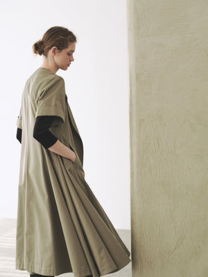This spring coat is made from over 6 meters of fabric and features multiple panels for a voluminous, flared hem.