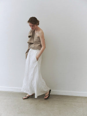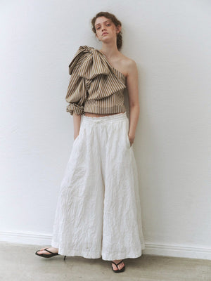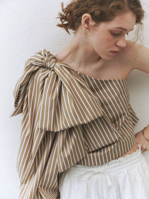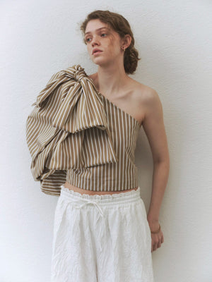 BROWN STRIPE A one-shoulder top with shoulder ribbons that exudes a dramatic presence.