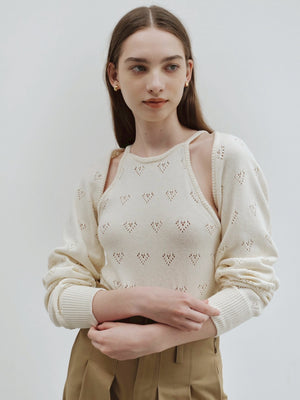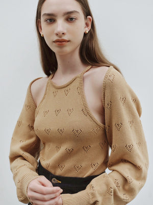 BEIGE A heart-patterned openwork knit bolero that adds a touch of sweetness.