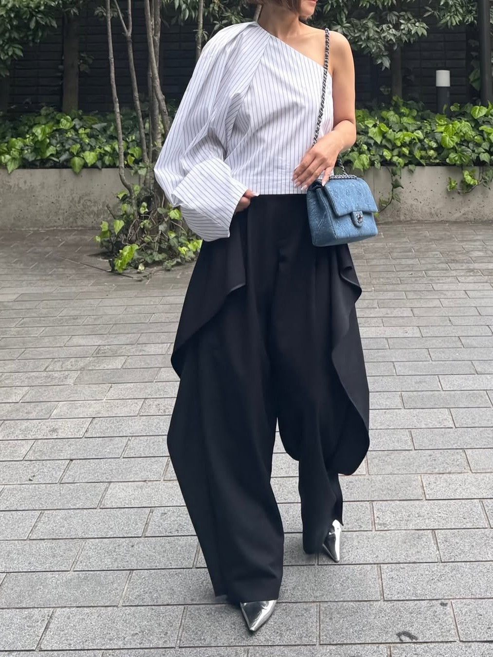 エレガントさの中にモードなムードも感じさせる、まさに大人のためのパンツです。
