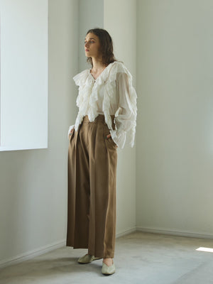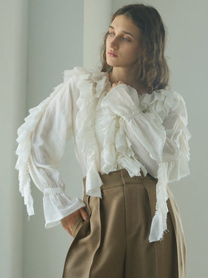 生地をふんだんに使用したフリルのデザインが目を惹くブラウス。