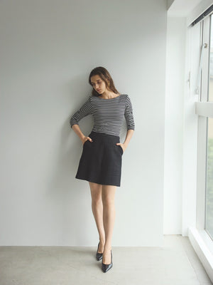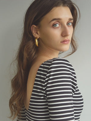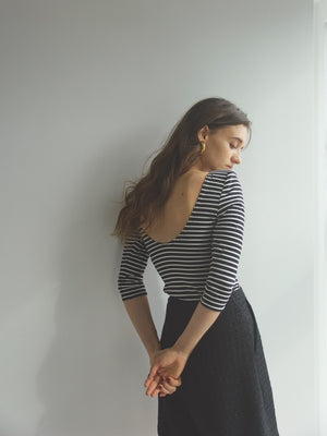 フロントはベーシックなボートネックで上品に、背中は大胆なカッティングで抜け感を演出。前後で印象の変わるデザインが、1枚でコーディネートを格上げしてくれます。