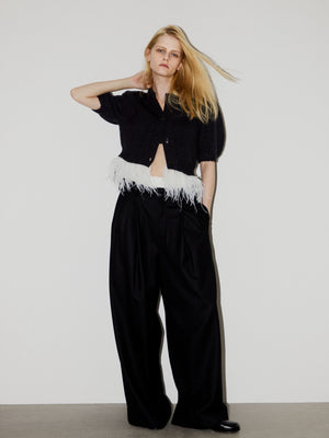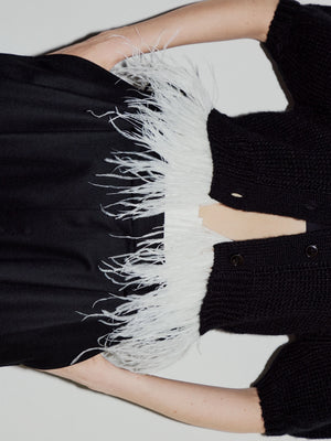 ボリュームのあるパフスリーブと、裾にあしらわれたフェザーのディテールが動くたびに軽やかに揺れ、上品で華やかな印象を演出します。