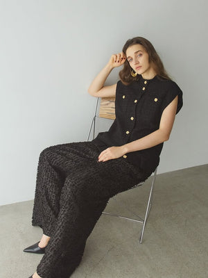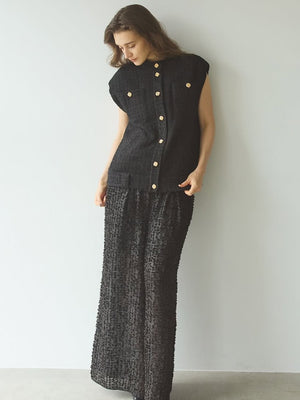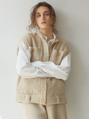 ジレはスタンドカラーと程よいパワーショルがポイント。単品でもインナーとのレイヤードでも映え、ゴールドボタンが全体を上品に引き締めます。