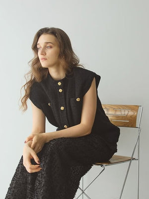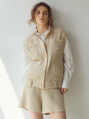 控えめな光沢感と立体感を持つツイード素材で仕立てたジレ。