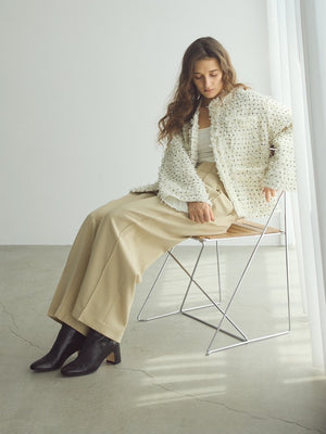 素材には、凹凸のあるモール糸を使用したドット風ツイードを採用。ランダムに表情を描くドットが立体感を生み出し、シンプルながらも奥行きのある存在感を放ちます。