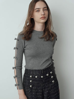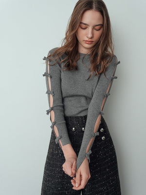 袖にたくさんリボンを取り付けた袖空きニットトップス。