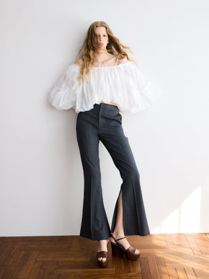 デコルテラインきれいに見せる、バルーンフォルムのオフショルトップス。